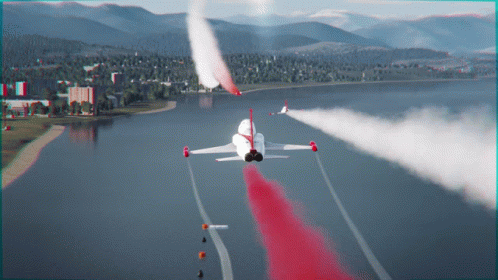 Sanal Türk Yıldızları (Virtual Turkish Stars) jet planes perform an impressive airshow over a scenic body of water.