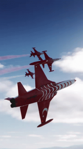 Red and white Turkish Stars jets perform stunning aerobatics, leaving patriotic smoke trails.