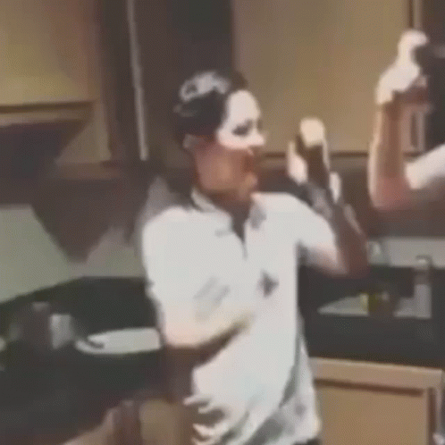 Sandro Marcos dancing energetically in a white polo shirt, holding an object in his raised hand.