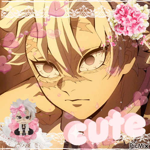 Cute Sanemi Shinazugawa from Demon Slayer, adorned with pink flowers, hearts, and lace overlays.
