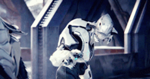 A Sangheili Elite from Halo wields a glowing energy sword in a futuristic interior setting.