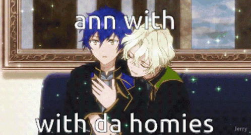 Anime characters Jun Sazanami and Hiyori Tomoe hugging, with 'ann with with da homies' text overlay.