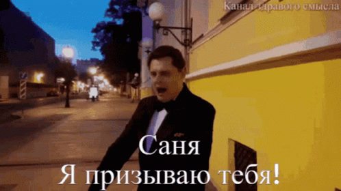 A man in a tuxedo on a street passionately calls out, 'Sanya, I summon you!'