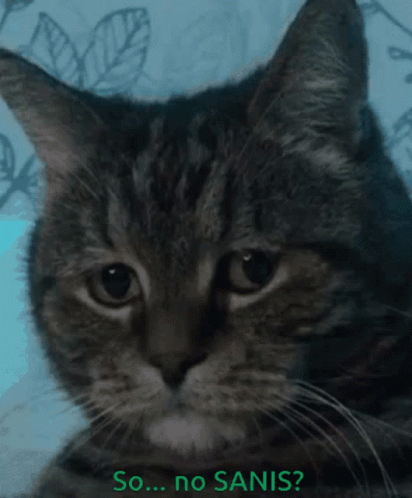 Sanis Jruggs, the sad tabby cat, looks disappointed while asking 'So... no SANIS?'