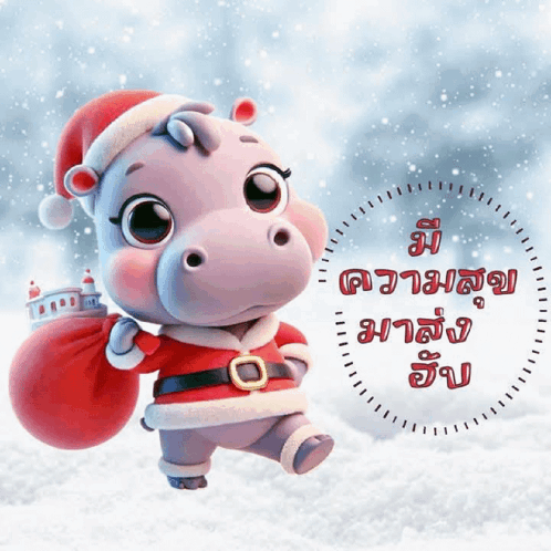 Cute animated hippo dressed as Santa Claus, delivering Christmas greetings and well wishes in a snowy scene.