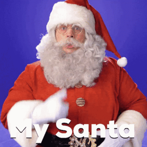 Santa Claus makes a 'shhh' gesture with a gloved finger to his lips, with 'My Santa' text on screen.