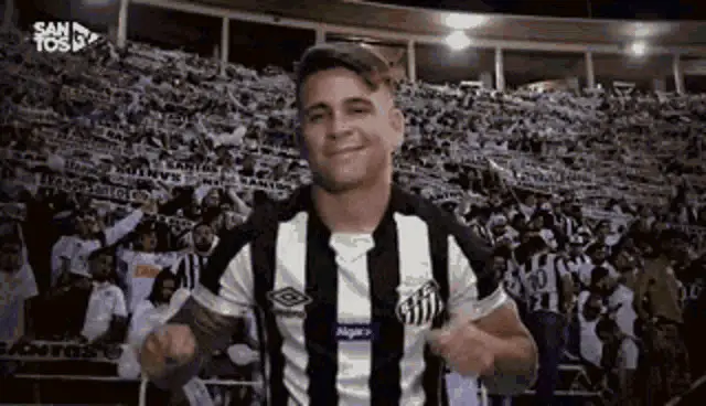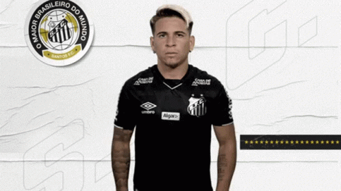 Soteldo, a player for Santos FC, stands proudly in his black team jersey, representing the Brazilian club.