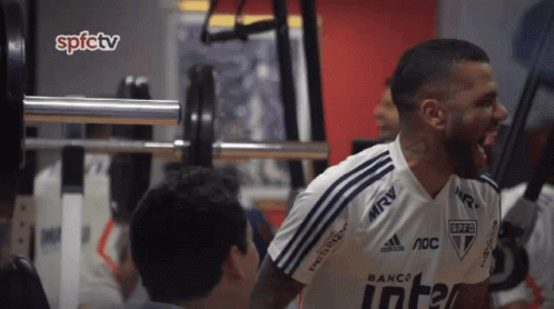 Dani Alves, wearing an Adidas SPFC shirt, training and laughing in the gym.