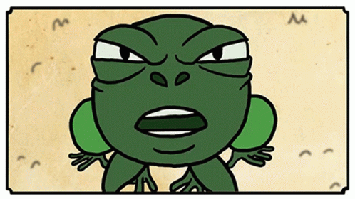 A grumpy cartoon frog with a pacifier, initially angry, then sucking on a blue pacifier.