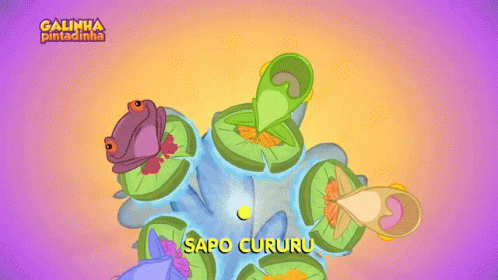Colorful animated frogs on lily pads from Galinha Pintadinha's 'Sapo Cururu' song, a beloved children's cartoon.