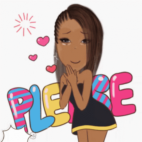 Animated cartoon girl Saqui Saquinon with hearts, asking 'PLEASE' in a cute way.