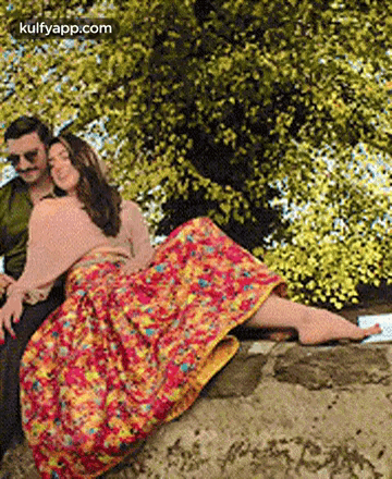 Sara Ali Khan and a man relax together on a stone wall under a large tree, enjoying a peaceful moment.