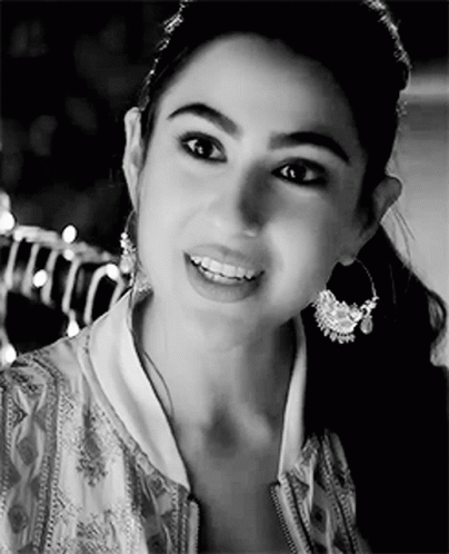 Sara Ali Khan smiles and talks in a close-up shot, wearing a patterned jacket and large hoop earrings.
