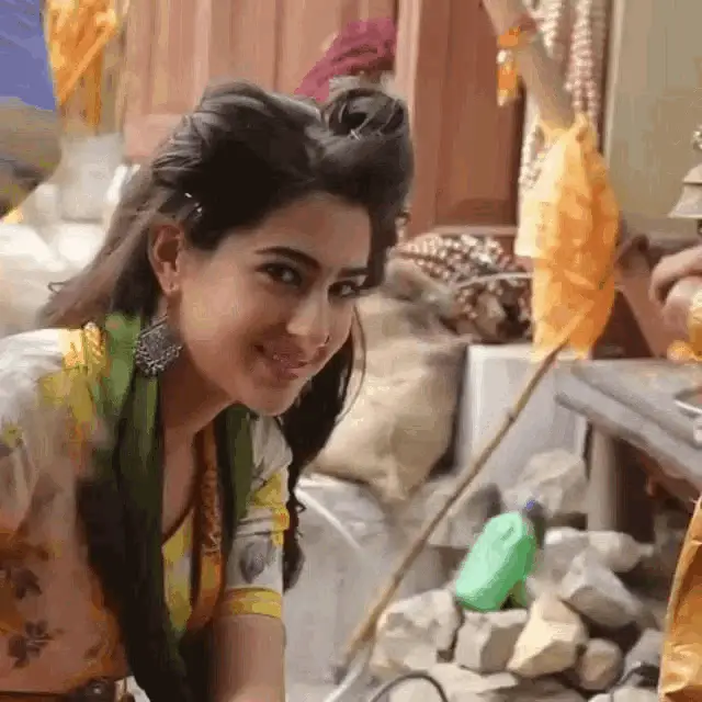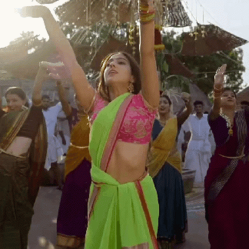 Sara Ali Khan gracefully dancing in a vibrant green saree with her arms raised during a festive event.
