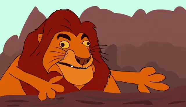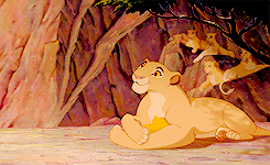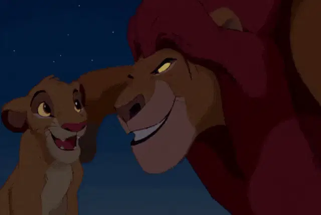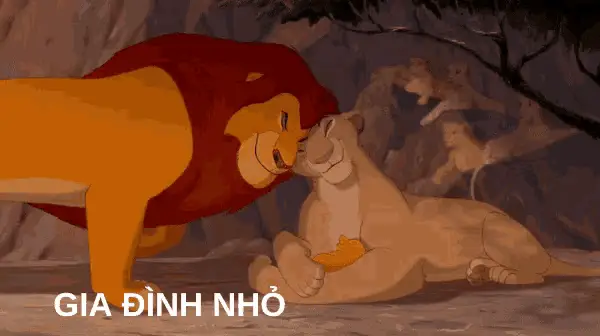 Mufasa nuzzles Sarabi in a tender moment, with lion cubs playing in the background from The Lion King.