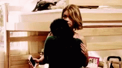 Sarah Hyland (Haley) shares a warm hug with another character in a scene from Modern Family, holding a phone.