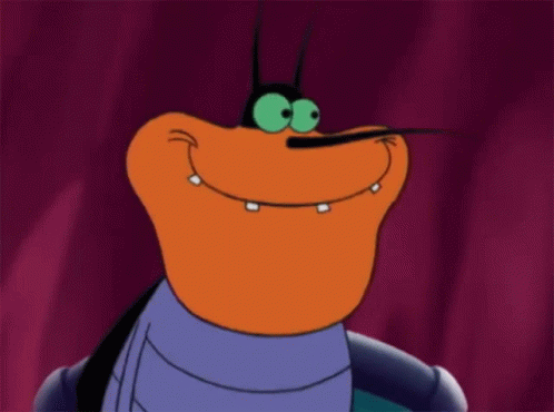 A close-up of Dee Dee, the cockroach from Oggy and the Cockroaches, showing a wide, sarcastic grin.