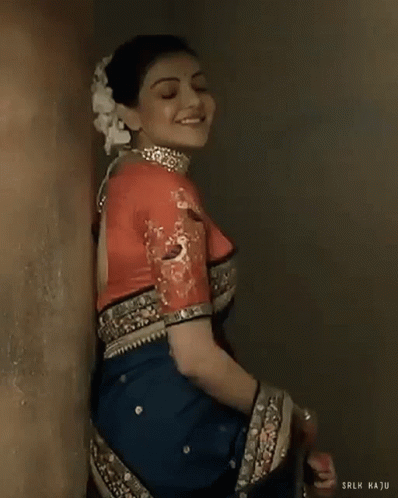 Kajal Aggarwal looking stunning in a blue saree with a red embroidered blouse, smiling gracefully.