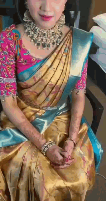 Sareefans Qaz elegantly poses in a beautiful gold saree with a pink embroidered blouse and traditional Indian jewelry.