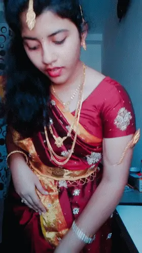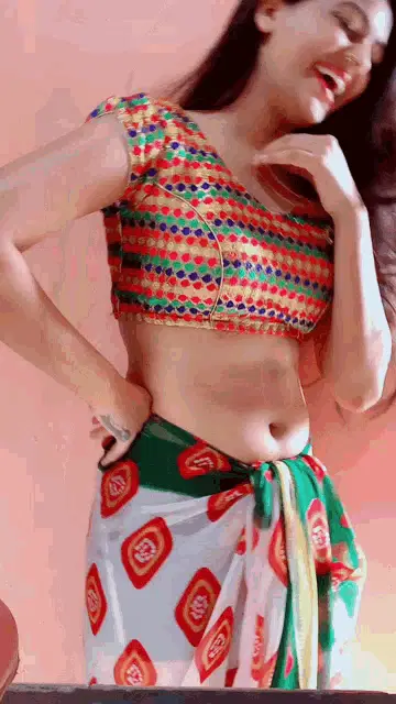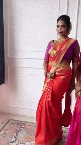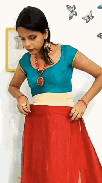 A woman in a blue top and red skirt demonstrates how to drape a red saree, with decorative butterflies on the wall.