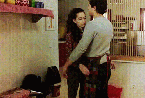 Aslıateş shares a warm embrace with a man in a kitchen, a tender and intimate moment.