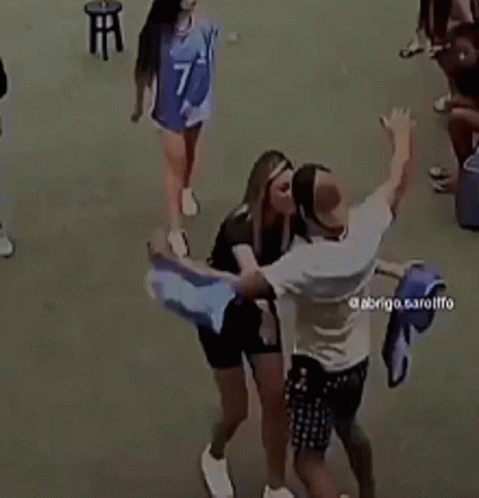 Sarah Andrade and Rodolffo Matthaus share a warm hug on a field during Big Brother Brasil 21.