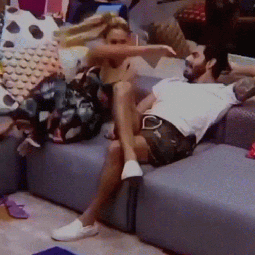 Rodolffo and Sarah, known as Sarolffo, share a tender moment on the couch during Big Brother Brasil 21.