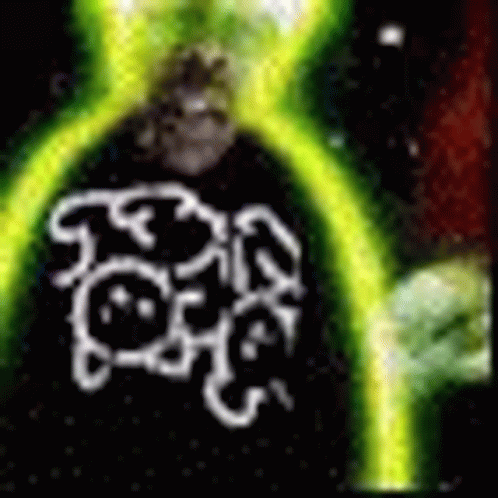 A highly pixelated, glowing figure of Sas, possibly a meme or character, with a green outline.