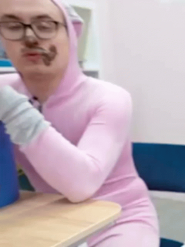 Sasha Shpak and Kobyakov: A man in a pink suit with chocolate on his face, holding a bucket of snacks.