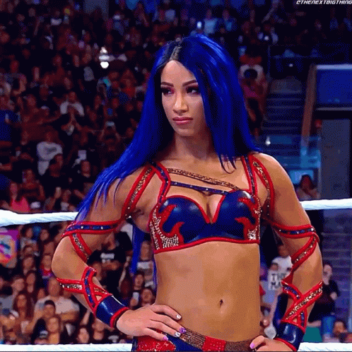 Sasha Banks, the WWE superstar, stands confidently in the wrestling ring with her hands on her hips.
