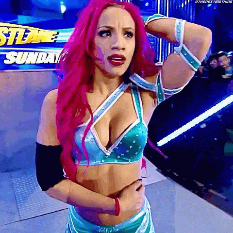 Sasha Banks reacts with a pained expression, holding her stomach in the wrestling ring during a WWE event.