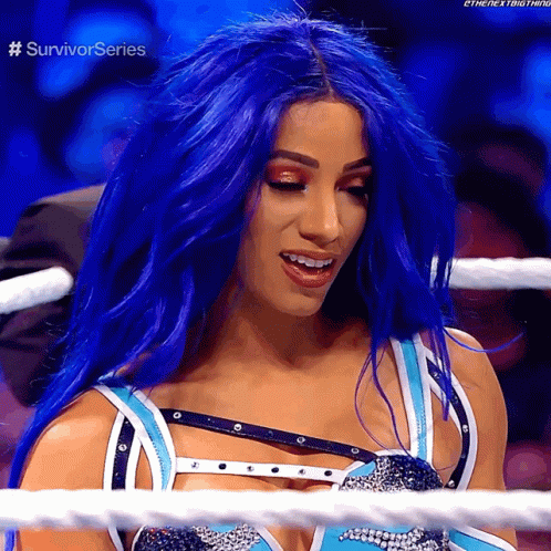 Sasha Banks, with vibrant blue hair, smiles playfully with her tongue out in a wrestling ring during Survivor Series.