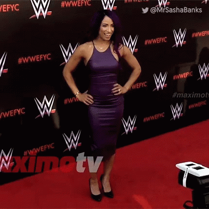 WWE Superstar Sasha Banks, also known as 'The Legit Boss', poses on the red carpet at a WWEFYC event.