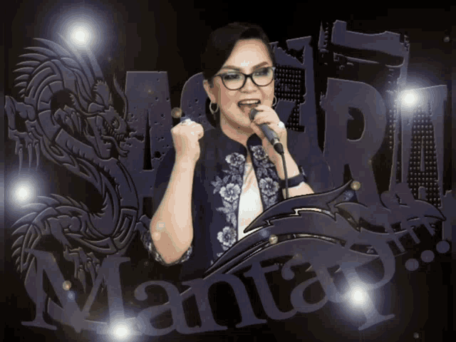 Saskra Mantap delivers an energetic singing performance into a microphone, surrounded by sparkling effects.