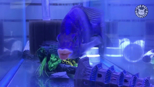 A large fish with prominent, 'sassy' lips swims gracefully in a blue-lit aquarium.