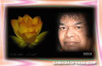 Sathya Sai Baba's image next to a glowing lotus flower, with the website saibabaofindia.com displayed.