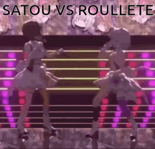 Satou and Roullete engage in a lively dance battle on stage, performing energetic choreography.