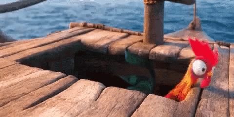 A cartoon chicken hilariously peeks out of a hole in a wooden boat on the ocean, looking surprised.