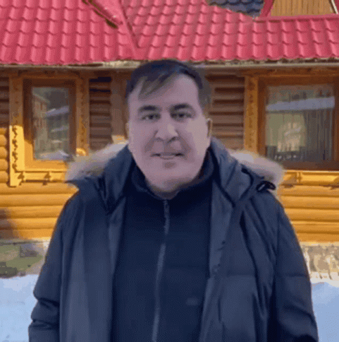Mikheil Saakashvili puts on sunglasses in front of a log cabin, embodying the 'Deal With It' meme.