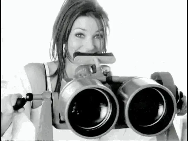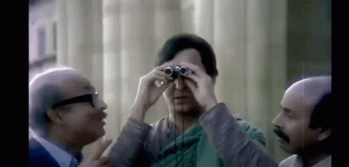 Satyajit Ray's Feluda uses binoculars while two men talk to him in this classic Bengali movie scene.