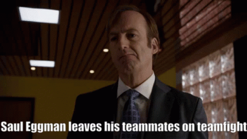 Saul Eggman, also known as Saul Goodman from Better Call Saul, is shown with text about leaving teammates on teamfight.