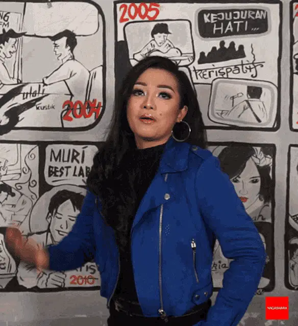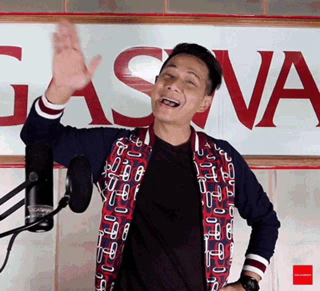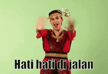 Woman in traditional Batak attire cheerfully gestures while saying 'Hati hati di jalan' (Be careful on the road).