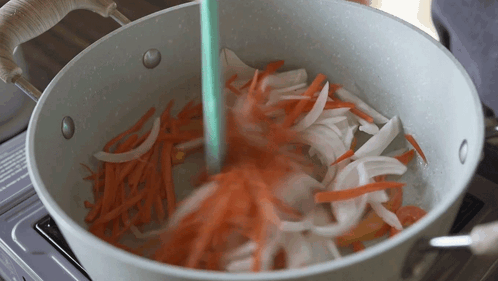 Sautéing julienned carrots and sliced onions in a pot with a green spatula, presented by Two Plaid Aprons.