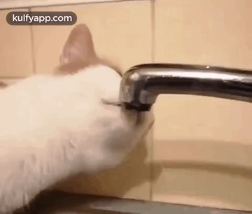 A cute white cat cleverly drinks water directly from a running sink faucet, highlighting water conservation.