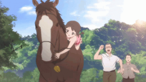 Sawa Okita joyfully rides on the back of a large brown horse, while two men react in the background.