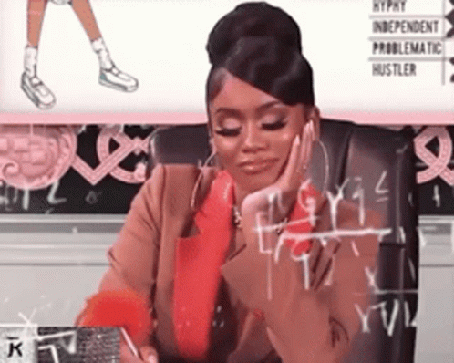 Saweetie sits at a desk, looking thoughtful with her hand on her face, surrounded by calculations.