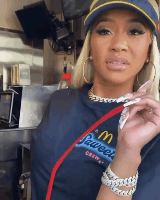 Saweetie enjoys her McDonald's meal, showcasing her signature style and the special 'Saweetie Meal' in a vibrant setting.