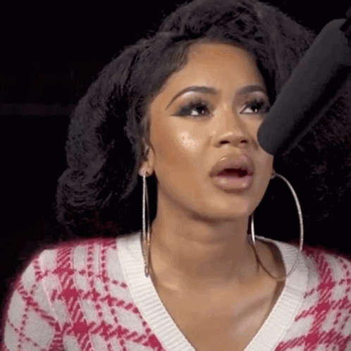 Saweetie reacting with a 'taste' or 'disgusted' expression while speaking into a microphone, wearing a pink and white sweater.