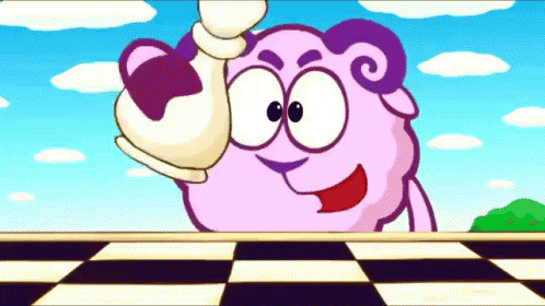 Barash from Smeshariki cartoon playing an intense game of chess with a determined expression.