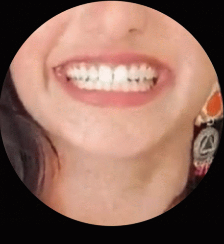 A close-up of a person's mouth and teeth, framed in a circle, with the caption 'say cheeeeeeeeeeeeeese....'